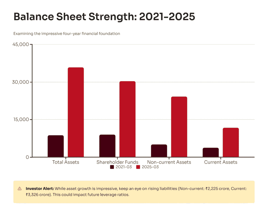 Key highlights include shareholder funds rising from ā¹8,999 crore in 2021 to ā¹30,317 crore in 2025, indicating robust capital raising and retained earnings. Non-current liabilities increased to ā¹2,225 crore, primarily long-term borrowings for expansion. Current liabilities grew to ā¹3,326 crore, reflecting operational payables.